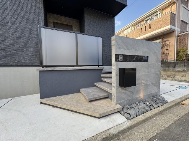 ご実家の敷地内に二世帯住宅を構えられた施主様。ふたつある玄関を繋ぐ一体感のあるファサードは『LIXIL:プラスG』のフレームや格子材を使用した圧迫感のない目隠しが印象的です。高級感のある石貼りの門柱は、それぞれの玄関にデザインを変えてご提案しました。 |