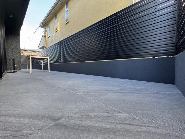 「お庭をもっとかっこよくしたい」とのご要望により、モダンでシックな建物の雰囲気に合わせた重厚感のあるデザインをご提案しました。隣家が接近していること、遮るものが何も無かったことから、どっしりとした壁やルーフで空間を間取り、プライベート感を高めています。 |