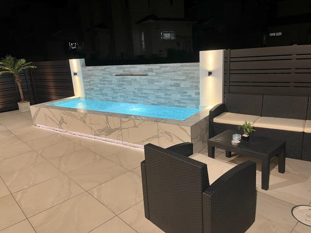 タイルテラスのステップ部分を施したブルーのバーライトでクールに、ゴージャスに、幻想的な空間をデザインと壁泉から流れる水を感じる贅沢なお庭を演出。 |
