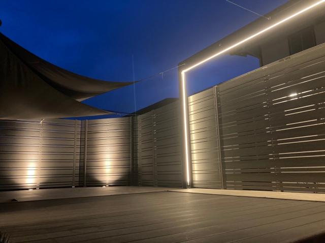 タイルデッキとソファーをイメージしたタイル目地のベンチ、およびテラス屋根を配置しました。 ベンチのタイル目地を中心にした、広がる屋根とデッキの美しいシンメトリーな外観を提供しつつ、 手動開閉のできるテラス屋根により、日陰を取り入れつつも、自由に光も取り入れられるガーデン空間を確保しました。 夜になれば、ベンチ周辺と手すり裏がライトアップ。 柔らかな照明たちと、あたたかみのあるウッドデッキが相まって、非常に美しい空間を演出してくれます。 |