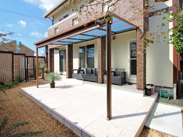 レンガ調のナチュラルな建物の雰囲気に合わせ、木調風のテラス屋根をメインにお手入れの楽な過ごしやすいお庭をご提案しました。既存の生け垣は人工木のフェンスへやり替え、足元には爽やかなタイルテラスが広がります。夜にはほんのり灯る明かりが心地よい、365日何時でも楽しめるお庭が完成しました。